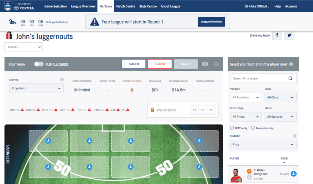 Here is an example of what you will see once you have signed up and logged in – a blank canvas where you can make unlimited changes up to round 1 which begins on Wednesday March 16 with the Dogs vs Dees in a grand final rematch.