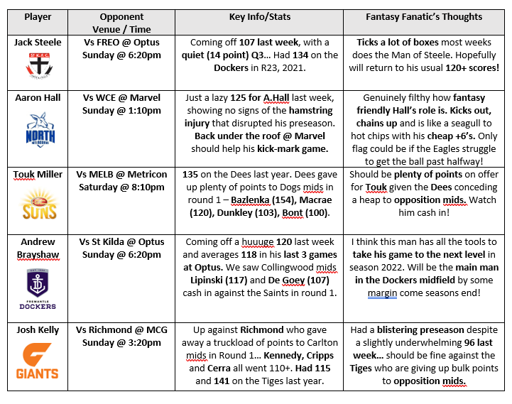 Remember, we are only 1 week into a 23 week season! While there were plenty of underperformers in round 1, don’t panic and get stuck with knee-jerk moves that you will regret longer term. Case in point with Big Max Gawn who hit a piss poor 73 in round 1 last season and went on to average 109! Moral of the story is to wield the axe wisely! You picked your (specifically) premiums for a reason, now it is time for them to hold up their end of the bargain. Given all the carnage at the selection table, you would be one of very few coaches afforded a luxury trade this weekend anyway! With the rolling lockout, it may be worth holding on to at least one trade as there is every possibility that the Fantasy gods throw us another curveball between now and Sunday night!