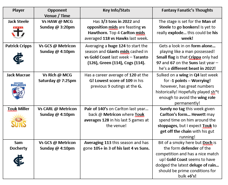 There’s plenty of hype around a bunch of players who have got off to a flyer in season 2022! If the price is right and you nail these selections… they could be the difference and your leg up on the competition! In the coming weeks, we will likely transition to the typical downgrade-upgrade trading strategy. With cash again tight this season, you may find yourself doing multiple downgrades to get to the player you want for an upgrade! Make the assessment, is saving the cash and possibly losing points in the short-term worth it for the longer term gain? Also important to have an eye on the dreaded byes which will happen from rounds 12-14… More on bye-planning in a future article!