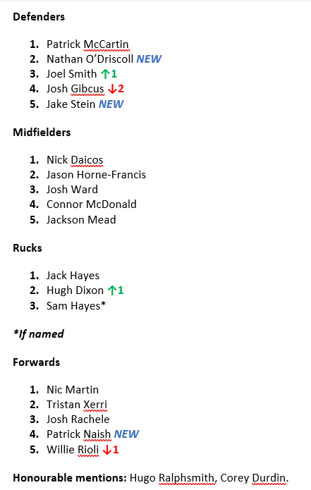 Petracca (77), Oliver (68), Wines (36), Mayes (17), etc. – Ummmmm no.