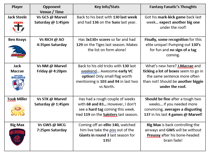 Get yourself Fantasy ready for round 5 with this last minute guide!