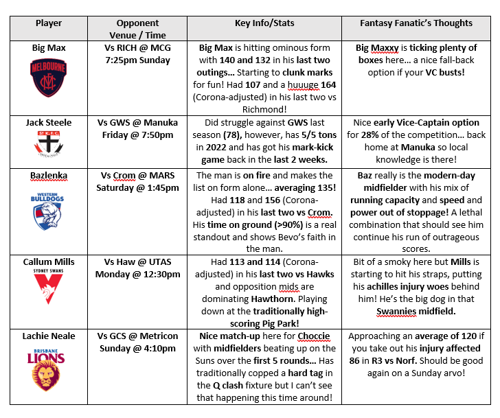 A return to the traditional Friday night fixture to begin round 6 with the Giants hosting the Sainters at Manuka Oval! I look forward to braving the brisk conditions to watch these two sides in action. Despite no Thursday game, there are still plenty of great early vice-captain options!