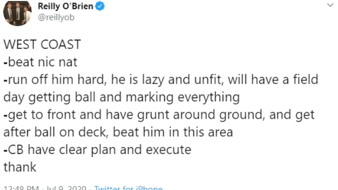 ROB (121) – How about that for a game from the big red-headed, technology nuff (see below for context – instant meme)! Clearly revelled in the absence of Timmy English and was massive 17 touches, 4 marks, 5 tackles and 49 hitouts! Still behind the big dogs but a cheeky draft slider for some.