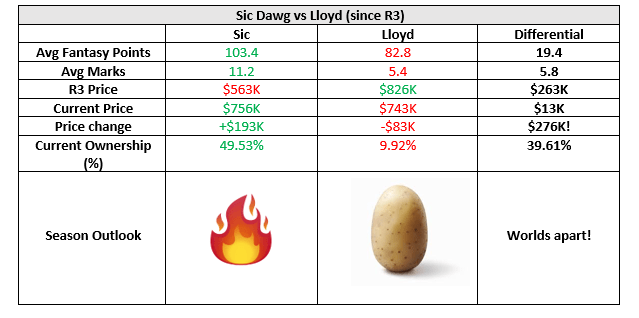 Sic Dawg (114) – Sickening. Another dominant Sic Dawg performance and yet another F you to the Juggernauts and the other 50% of morons who didn’t pick him. Racking up cheap +6’s for fun with the odd intercept! Has barely defended in his life but coaches won’t give a rats toss bag if he continues this stellar form!