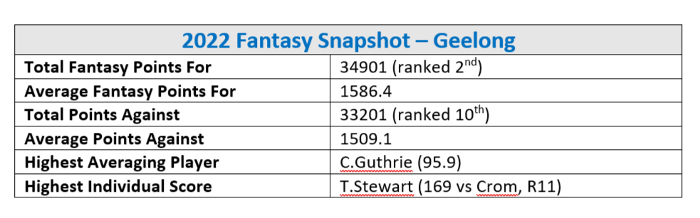 Pussies Geelong… The greatest team of all in 2022. From a fantasy perspective, a strong season ranking 2nd overall for Fantasy points for without having a player averaging over 100! A testament to a champion team full of contributors week in, week out.