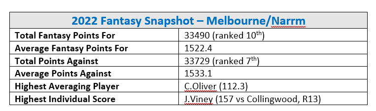 Given the Dees list profile and solid playing 22, we didn’t see a lot on the rookie front in season 2022. The only names that spring to mind here are Joel Smith (Averaged 40 over five games) and Toby Bedford (Averaged 43 over eight games – now traded to BWS). Elsewhere we had Dan Turner play on Queen’s Birthday before copping a head knock and not returning to the 1’s for the rest of the season! Hardly inspiring stuff from a rookie perspective but probably an insight into how tough it is to crack into the Dees AFL team.