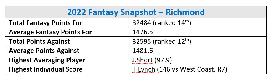 Richmond… There abouts in season 2022 but my word did they steal defeat from the jaws of victory on multiple occasions! From a fantasy perspective, not a heap to crow about with the exception of Jayden Short’s start to the season and a couple rookies coming through late in the piece.