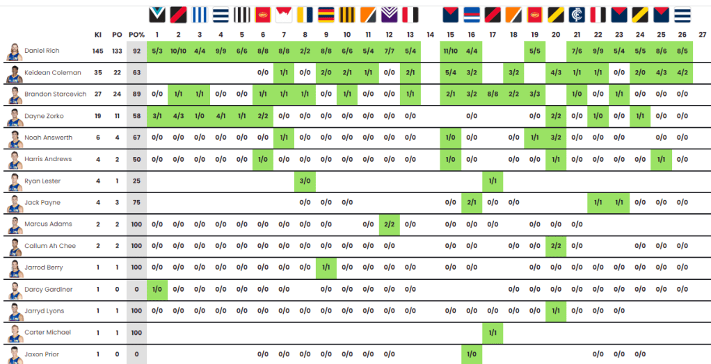 We saw an atypical spread of kickers at Carltank this season, with the top two (Doch and Saad) only registering 29% and 26% of kick-ins respectively – a far cry from other clubs where an individual or two have a monopoly/duopoly on the cheap +3s! Despite these comparatively lower numbers, Doch and Saad are probably the most assured in possession when looking to peel off a kick! You only have to go to a Carltank game to hear the flogs go “Woof” whenever leather makes contact with the left boot of Saad. Despite leading the way on the kick-in front, we saw both Doch and Saad blank on multiple occasions throughout 2022 (four and two times respectively). This was partly attributable to the Doch spending a bit more time in the engine room. This was particularly evident in the final two rounds of the season where the legend managed to peel of 123 and 137 at the coalface! Elsewhere, if we were to extrapolate the data, we’d probably see a table with Zac Williams atop as he battled injuries throughout 2022… For the record, he managed 34 kick-ins (31 play-on) in 9 games.