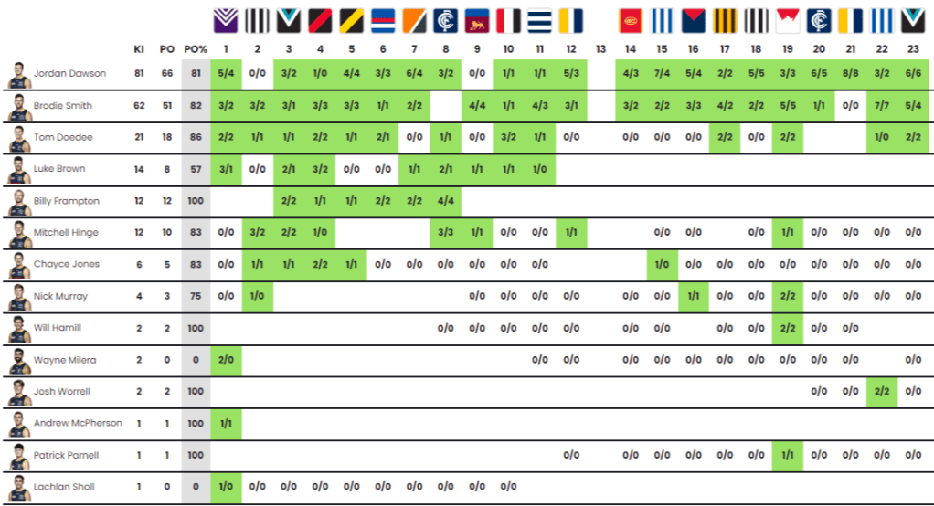 - J.Dawson blanked in two games (R3 and R9), attributable to his prowess as a swingman, at times playing a ‘Mr Fix It’ type role for Crom.