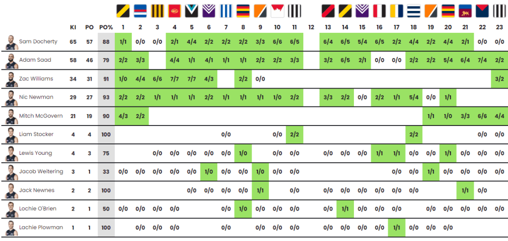 As aforementioned, an interesting trend emerged in the final two games of the home and away season, with Docherty playing as a pure midfielder resulting in 0% kick-ins… I honestly think he is too valuable to not play around the footy for the Blues. As such, I think Doch will spend more time on-ball in 2023 given how successful it was for Vossy late in the piece! In good news for coaches, surely with such a small sample size he will still be available as a defender (now confirmed – yessir!) – pure sh*thousery but what the game is all about! The only flag I will mention is that R22 and R23 saw Cerra and Walsh out respectively. Even if the mid role didn’t come to fruition, he’ll be up there again vying for a top-3 defender position so no stress there! Preseason will be an interesting watch – make sure you keep an eye out! Elsewhere, I think we’ll see much of the same in terms of spread with seagulls like Newman and Williams wanting their lick of the ice-cream… Saad is probably the best kick but these blokes need to stay relevant somehow! If (and only if) Williams picks up more cheap +3’s coupled with a potential Doch role change, I may consider in Fantasy with an injury discount to be applied.