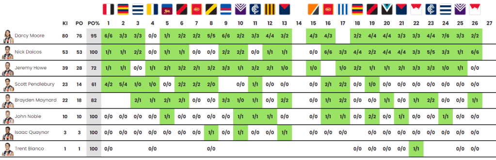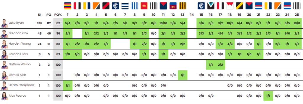 - Of Freo’s 222 kick-ins, L.Ryan took 136 of his own, equating to 61%! This is the second most prolific monopoly on kick-ins in the league (not accounting for missed games – i.e., D.Rich)