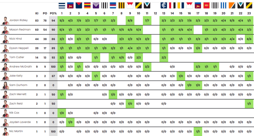 - No one really had a monopoly on kick-ins at Essendon(e) in season 2022, with Ridley (34%), Redman (25%) and Hind (18%) taking their fair share of Essendon(e)’s 242 kick-ins and 13 separate kickers.
