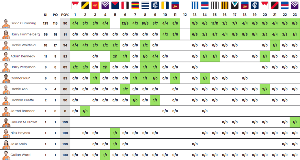 - H.Himmelberg took all of his 56 kick-ins from R10 onwards at an average of 4.3 per game… See analysis below for why this occurred!