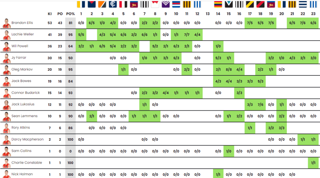 Looking at how 2022 finished up as well as the Suns trade period and I can’t see why Brandon Ellis wouldn’t continue his role as the Suns main man from kick-ins. The departure of Jack Bowes and long-term injury to Lachie Weller only strengthen Ellis’ credentials to enjoy somewhat of a monopoly on the kick-ins – at least for the first half of the season whilst Weller remains on the side lines. The only flag I will mention is the potential return of Wil Powell from a gruesome broken leg… By all reports, he is aiming to play R1 which would be an incredible effort! If this comes to fruition, I’d expect to see more of a duopoly at the kick-ins which may dissuade coaches from starting with Ellis. Regardless, preseason will be an interesting watch for those bullish on Ellis as a starting selection in 2023!