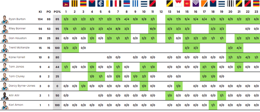 I won’t sugar-coat it, there’s not really any household fantasy names appearing in the table above, though you could make an argument for Dan ‘Heart Palpitations’ Houston given what he is capable of on his day… His kick-in numbers were true to form, blanking in six of his 21 games. Taking a closer look at the above table and you’ll notice Trent Mackenzie only managed 15 kick-ins despite his reputation as “The Cannon“. TMac’s season was marred by a knee injury sustained in R3 after which he only played two senior games… Unsurprisingly, in every game he played >10% game time, he got his lick of the ice-cream with at least two kick-ins per outing. Needless to say, if we extrapolated the data there is every chance TMac is right in the frame with Burton as Port’s most popular distributor from fullback. Elsewhere, we saw a late season role change for lethal left footer Kane Farrell. This resulted in him being utilised from the kick-ins in the final month of season 2022. Having not averaged over 50 in a season since his debut in 2018, Farrell enjoyed more game time and posted two of his best four fantasy scores following the role change to the defensive half.