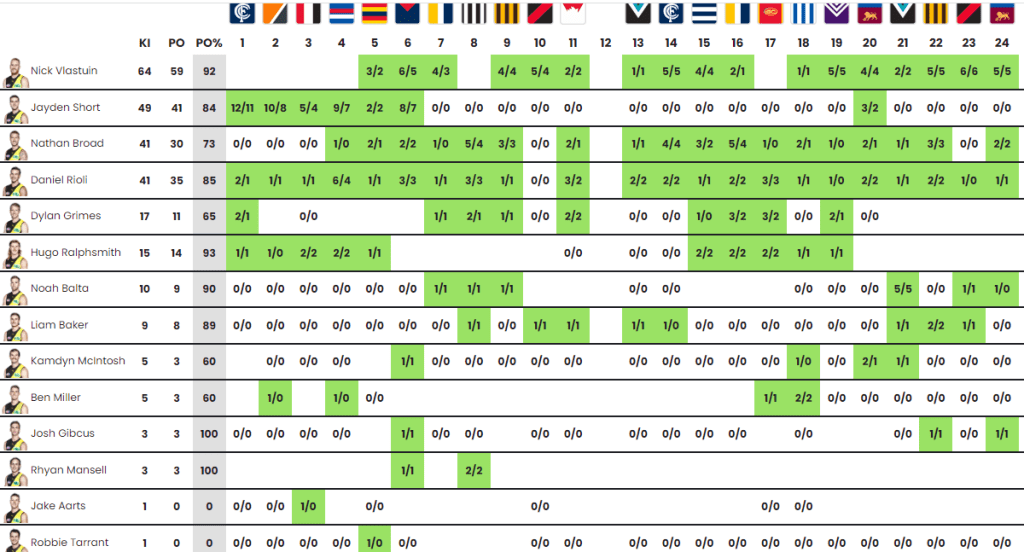 - Richmond are the only club in the competition to have four separate players record >40 kick-ins for the season… With Short’s abrupt role change, someone’s got to do it!
