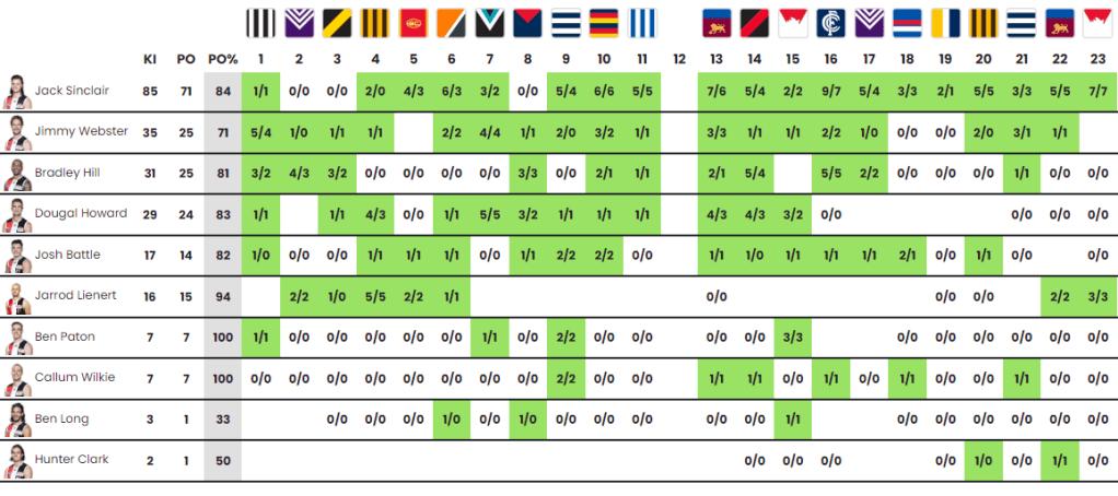 - Despite trailing multiple teammates following the first month of footy, it was J.’Monsieur Calves’ Sinclair who led the way for the Sainters. He took 85 of a possible 232 kick-ins, equating to 37%!