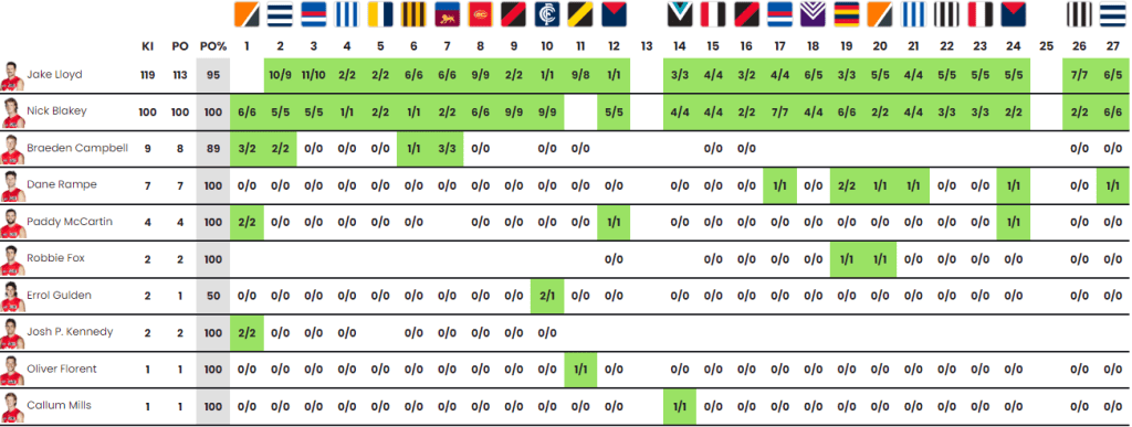 It was all about the duopoly of Lloyd and Blakey giving us Coles/Woolies vibes in season 2022. The elite half-back role was there to be filled following the departure of Jordan Dawson to Crom and it was the Lizard Nick Blakey who took the opportunity with both hands. Swannies coaching staff and fans alike would have been elated with the emergence of Blakey off half-back… He still has plenty to learn but showed flashes of brilliance throughout the season! On the other hand, fantasy coaches who ran with Lloyd (myself included!) would have been banking on a monopoly on kick-ins which unfortunately did not come to fruition. 2022 was Lloyd’s worst averaging season since 2016 – for the record it was 91.1. Still pretty good stuff but not enough to mix it with the big boys! Elsewhere, nothing really significant to speak of… I think someone like Braeden Campbell who is known for his dash and penetrating kick would get a greater lick of the ice-cream at another club… He struggled to cement his spot in a solid Swans outfit so 2023 will be an important season for him.