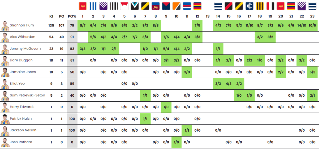 Aside from the kick-in mainstay that was Shannon Hurn, it really was horses for courses at the Weagles throughout 2022 based on who was available / not selected in WAFL Colts. Alex Witherden’s fantasy numbers have always been pretty good, but his job security has been shaky at best over his career and 2022 was no different… Those who got sucked in (I was strongly considering!) midseason got burnt verrrrrry quickly in a perfect example of how this game shits you from time to time! Certainly glad I didn’t go through with the trade in though his role was undeniably delicious, borderline Jack Ziebell 2021 vibes. Had Witherden held his spot and McGovern remained healthy, it is unlikely we would have seen a domination of this proportion from Shannon Hurn. Elsewhere, we saw the likes of Liam Duggan and Elliot Yeo get their lick of the ice-cream in the back half of the season… Duggan’s kick-in numbers were particularly patchy which made it difficult for coaches to get a read on his role! Thankfully, this was later in the season when coaches would have been looking to ‘complete’ their squads.