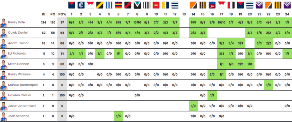 - Based purely on play-on percentage for each clubs top two kickers, the doggies combination of Dale and Daniel ranked 3rd highest with a combined play-on percentage of 95.6% (178/186)! This say behind Collingwood (Moore/Daicos – 96.7%) and Sydney (Lloyd/Blakey – 97.3%).