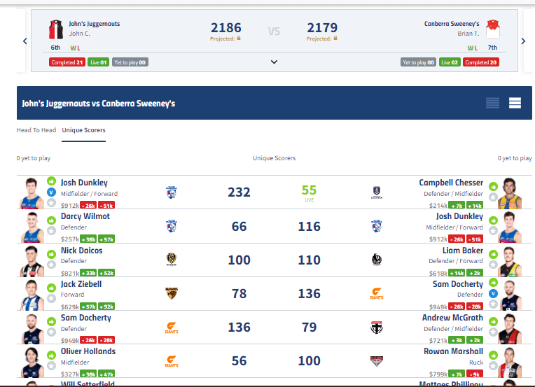 After a 20 and a 30 in the first two weeks, Chesser needed to pull 63 out of his ass for the win and nearly got Brian T (surely Brian Taylor right?) over the line! I thought I heard Bristle barracking harder for Oliver and Gulden (both uniques) in his call on of Swans vs Dees Sunday arvo! After advertising this victory, there’s every prospect that the fantasy gods (and karma bus!) pull me into line for an agonising L… Only time will tell!