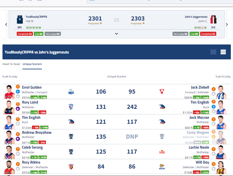 McGrath (117) – Hahaha the irony… After being a popular starting selection, McGrath shat the bed nine weeks straight only to pull this out of his ass after everyone gave him the ass! Essendon played a high mark game and McGrath capitalised!